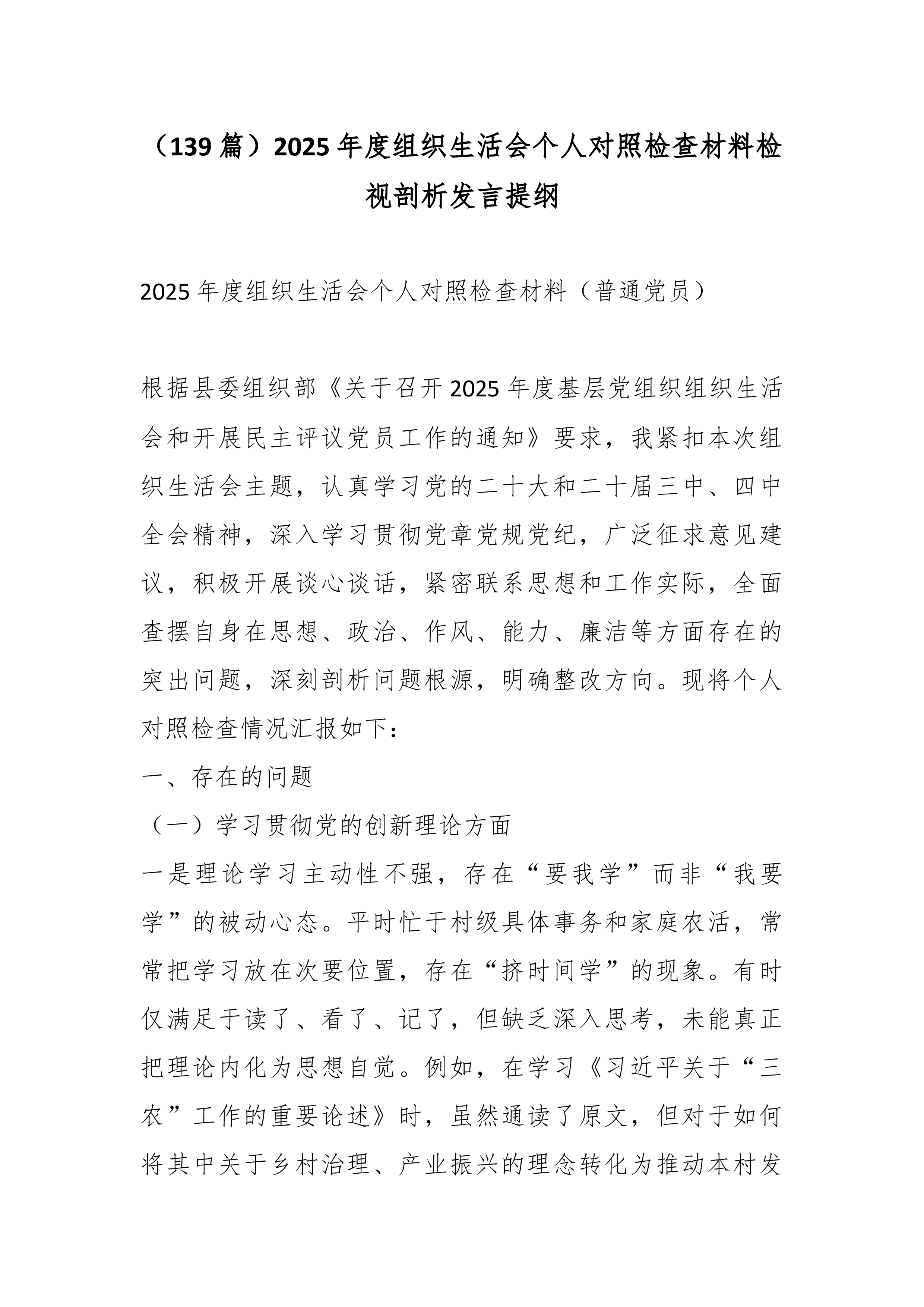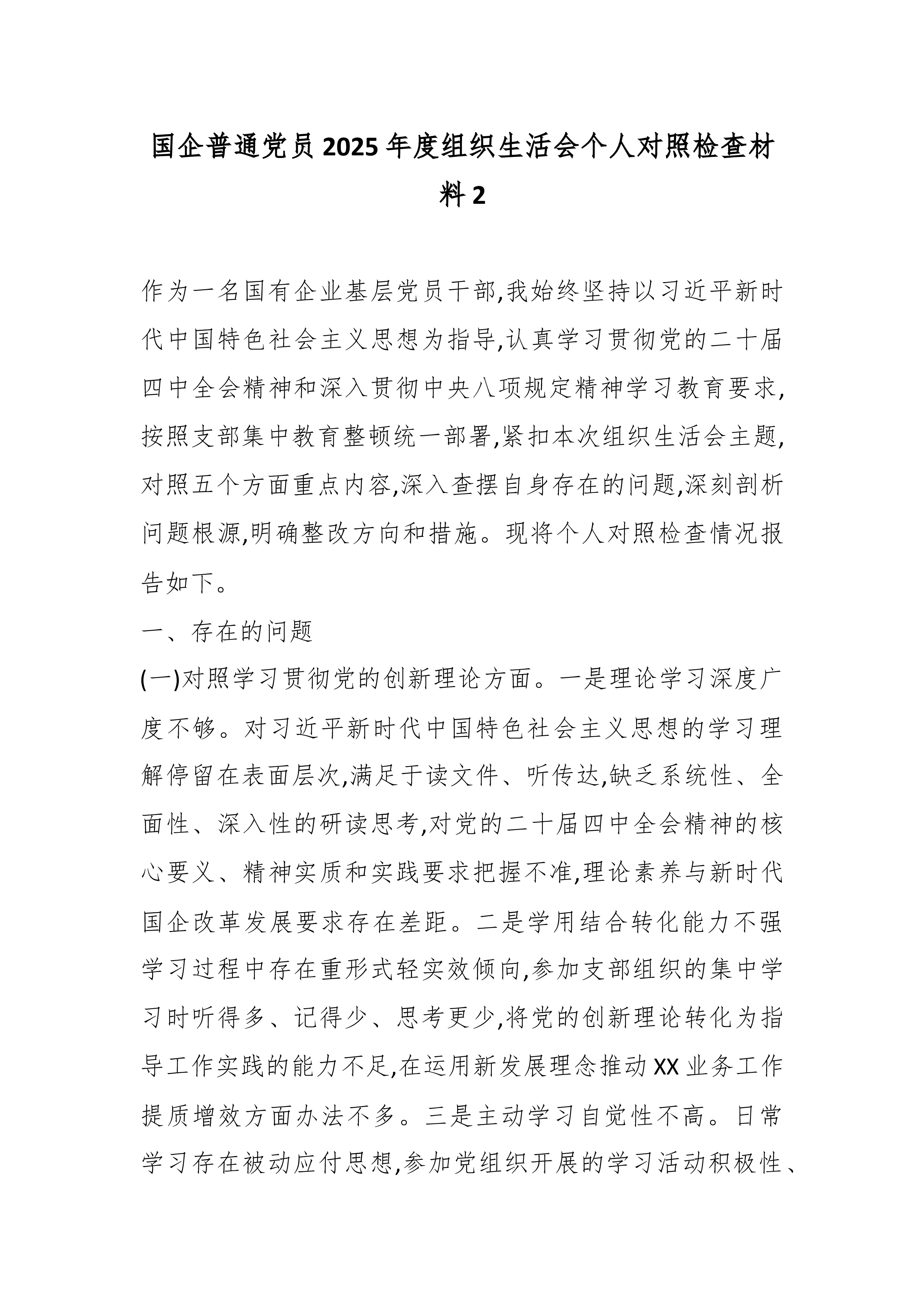 国企普通党员2025年度组织生活会个人对照检查材料2作为一名国有企业基层党员干部,我始终坚持以习近平新时代中国特色社会主义思想为指导,认真学习贯彻党的二十届四中全会精神和深入贯彻中央八项规定精神学习教育要求,按照支部集中教育整顿统一部署,紧扣本次组织生活会主题,对照五个方面重点内容,深入查摆自身存在的问题,深刻剖析问题根源,明确整改方向和措施。现将个人对照检查情况报告如下。一、存在的问题(一)对照学习贯彻党的创新理论方面。一是理论学习深度广度不够。对习近平新时代中国特色社会主义思想的学习理解停留在表面层次,满足于读文件、听传达,缺乏系统性、全面性、深入性的研读思考,对党的二十届四中全会精神的核心要义、精神实质和实践要求把握不准,理论素养与新时代国企改革发展要求存在差距。二是学用结合转化能力不...
