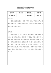 党员谈心谈话记录表谈话人王玉红被谈话人王瑞籽谈话时间谈话地点会议室王玉红:根据党支部的安排,按照“不忘初心、牢记使命”主题教育部署要求,今天我和你进行谈心谈话,希望你对支部及我本人提出意见建议。王瑞籽:作为班子成员,“不忘初心、牢记使命”主题教育开展以来,我认真读原文、悟原理、学原著,不断加强学习,全面提高自身政治素质,牢记党的宗旨,增强党性的锻炼,同时结合自身的工作实际进行了深入思考。在今后的工作中,希望支部班子更要坚定“四个自信”,做到“两个维护”,对表对标找差距,要加大改革创新力度,联系审批工作的社会实践,推进行政审批服务工作,更好完成自己分管领域的支部工作。党员谈心谈话记录表谈话人王玉...