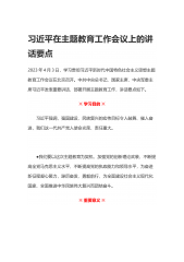 习近平在主题教育工作会议上的讲话要点2023年4月3日,学习贯彻习近平新时代中国特色社会主义思想主题教育工作会议在北京召开。中共中央总书记、国家主席、中央军委主席习近平发表重要讲话,部署开展主题教育工作,讲话要点如下。※学习目的※ 习近平强调,强国建设、民族复兴的宏伟目标令人鼓舞、催人奋进,我们这一代共产党人使命光荣、责任重大。 ●我们要以这次主题教育为契机,加强党的创新理论武装,不断提高全党马克思主义水平,不断提高党的执政能力和领导水平,为奋进新征程凝心聚力,踔厉奋发、勇毅前行,为全面建设社会主义现代化国家、全面推进中华民族伟大复兴而团结奋斗。※•重要意义※ 习近平指出,以县处级...