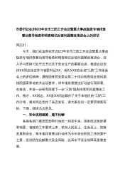 市委书记在2023年全市三防工作会议暨重大事故隐患专项排查整治督导检查和明查暗访反馈问题整改推进会上的讲话同志们:今天,我们在这里召开2023年全市三防工作会议暨重大事故隐患专项排查整治督导检查和明查暗访反馈问题整改推进会,深入学习贯彻习近平总书记关于安全生产的重要论述,根据会议安排XX同志传达学习省委书记XX、省长XXX在全省“三防”工作座谈会上的讲话精神,通报国务院安委会第二十综合检查组反馈问题按照国家和省有关会议要求,对专项排查整治行动进行再部署、在推动,并进一步研究部署下一步“三防”隐患排查和问题整改工作。刚才,XX同志、XX县XX同志都作了关于本地区的“三防”工作介绍,相关同志也作了...