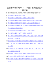 蓝秘书讲话系列407(72篇)各类会议主持词汇编1.东营市迎接国家卫生城复审工作指挥部启动会议主持词62.全县扶贫开发工作会议主持词3.在党工委中心组集体学习会上的主持词并讲话4.在县委全面深化改革领导小组第四次会议上的主持词暨讲话5.在市委招商引资暨对外开放工作会议上的主持词及讲话6.在旗人民政府2016年第二次全体会议暨政府系统党风廉政工作会议上的主持词和讲话7.市委书记穆为民市委常委(扩大)会议主持词8.张应龙在市政协“双月”协商会议主持词9.曾小平同志在市直机关基层党组织“五强创示范”项目拉练观摩会议上的主持词10.全区安全生产工作暨2018年区政府安委会第三次会议主持词11.张y波y...