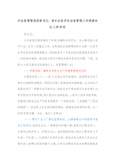 市应急管理局党委书记、局长在县市区应急管理工作视频会议上的讲话同志们:今年的国庆特护期处于非常关键的时间节点,有必要召集大家开个会,交代一些重点工作。这是我到应急管理局来以后第一次召开全市应急系统视频调度会,其目的是为了对我们的这套视频系统进行一次检验和演练,通过刚才的运行情况来看还是有些问题。下面,在刚才大家汇报发言的基础之上,我再强调三点:一、咬紧目标,确保全市安全生产形势持续稳定向好主要目标有三个:一是X长假必须平安稳定。虽然现在还处于常态化疫情防控期间,但国庆长假人流物流迎来高峰期,企业的生产经营也处于一种高位运行的状态,给安全生产带来的压力也非常之大,老百姓在过节的时候,我们是没办法...