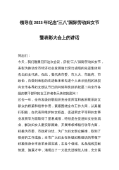 领导在2023年纪念“三八”国际劳动妇女节暨表彰大会上的讲话同志们:今天,我们隆重召开这次会议,庆祝“三八”国际劳动妇女节,表彰为推动全市经济社会发展做出突出成绩的先进集体和杰出妇女代表。在此,我代表市委、市人大、市政府、市政协,向受到表彰的先进集体和先进个人表示热烈的祝贺向全市各界妇女致以节日的问候和良好的祝愿!向全市各级妇联干部和妇女工作者表示亲切的慰问!过去一年,全市各级妇联组织充分发挥党和政府联系妇女群众的桥梁和纽带作用,紧紧围绕全市工作大局,认真履行职能,在代表和维护妇女权益、促进男女平等和妇女事业发展等方面取得了显著成绩,特别是在促进妇女创业就业、解决妇女儿童实际困难、开展维权维稳...