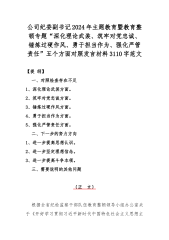 公司纪委副书记2024年主题教育暨教育整顿专题“深化理论武装、筑牢对党忠诚、锤炼过硬作风、勇于担当作为、强化严管责任”五个方面对照发言材料3110字范文【提纲】一、对照检查存在不足1、深化理论武装方面。2、筑牢对党忠诚方面。3、锤炼过硬作风方面。4、勇于担当作为方面。5、强化严管责任方面。二、下一步的努力方向1、进一步提高思想认识。2、进一步坚定理想信念。3、进一步提高斗争本领。三、需要说明的其他问题{正文}根据全省纪检监察干部队伍教育整顿领导小组办公室关于《开好学习贯彻习近平新时代中国特色社会主义思想主题教育暨纪检监察干部队伍教育整顿专题组织生活会》的通知文件精神及要求,我深入学习了习近平总...