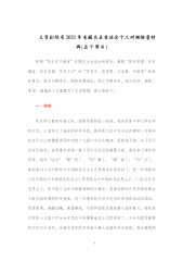 根据镇机关支部《关于召开2021年度支部组织生活会和开展民主评议党员的方案》要求,我紧扣主题,通过参加机关党支部学习和个人自学的方式,认真学习了习近平新时代中国特色社会主义思想、党的十九届六中全会精神、习近平总书记对xx做出的重要讲话和指示精神等内容。会前,我严格对照习近平总书记关于严肃党内生活的重要指示精神,对照党章党规党纪,对照初心使命,结合个人思想和工作实际,深入开展了谈心谈话、广泛征求了班子成员及干部群众的意见建议、认真查摆了自身存在的问题,在此基础上认真撰写了个人发言提纲。一、上年度组织生活会问题整改情况2020年度专题组织生活会后,我通过开展谈心谈话、征求意见、自身查摆出等方式,对...