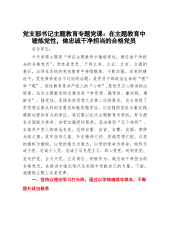 党支部书记主题教育专题党课:在主题教育中锤炼党性,做忠诚干净担当的合格党员各位同志:今天党课主题是“学在主题教育中锤炼党性,做忠诚干净担当的合格党员"。党性是党员、干部立身、立业、立言、立德的基石,必须在系统的党性教育中持续锻炼、不断加强。在党的建设中,党性修养是永不过时的话题,是党员干部政治生命的“根”和“魂”。党性教育是共产党人的“心学”,是党员正心修身的必修课。这次主题教育的总要求是“学思想、强党性、重实践、建新功”。强党性,是排在学思想之后第二位的要求,充分体现了学思想后要达到的首要目标就是强党性,以坚强的党性为重实践、建新功提供有力的保证。我们要以此次主题教育为契机,努力提各方面能力...