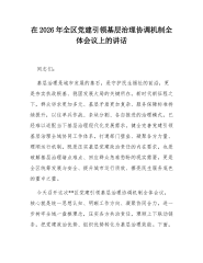 在2026年全区党建引领基层治理协调机制全体会议上的讲话同志们:基层治理是城市发展的基石,是守护民生福祉的前沿,更是夯实执政根基、稳固发展大局的关键所在。新时代新征程之下,群众诉求更加多元、基层矛盾更加复杂、服务保障标准持续提升,以往单兵作战、条块分割、各自推进的治理模式,已经难以适配当下基层治理现代化发展需求。健全完善党建引领基层治理全域协同工作体系,打通部门壁垒、凝聚各方力量、理顺运行机制,既是压实基层党建政治责任的内在要求,也是破解基层治理堵点难点、回应群众急难愁盼的现实需要,更是全区统筹发展与安全、提升城市运行质效、擦亮民生服务底色的重中之重。今天召开这次**区党建引领基层治理协调机制全体会议,核心就是统一思想认知、明晰工作方向、凝聚协同合力,进一步树牢全域一盘棋理念,压实各方共治责...