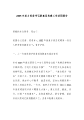 XX小学支部委员会2025年度党支部书记抓基层党建工作述职报告(精品)各位领导、同志们:大家好!2025年是实施“十四五”规划的收官之年,也是学校迈向高质量发展的关键一年。一年来,在市教育局党委的坚强领导下,我作为XX小学党支部书记,始终牢记第一责任人职责,以习近平新时代中国特色社会主义思想为指引,深入学习贯彻党的二十大和二十届三中、四中全会精神,团结带领全体党员教师,聚焦立德树人根本任务,将党建工作与学校教育教学中心工作紧密结合,持续擦亮“XX清风”党建品牌推动学校各项事业取得了新进展。现将本年度履职情况报告如下。一、砥砺初心担使命,履职尽责显担当(一)聚焦理论武装,筑牢思想政治根基始终将政治建设摆在首位,坚持把学习贯彻习近平新时代中国特色社会主义思想作为首要政治任务。全年主持召开支委会理...