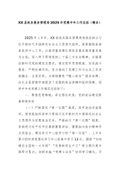 XX县政务服务管理局2025年党建半年工作总结(精品)2025年上半年,XX县政务服务管理局党组坚持以习近平新时代中国特色社会主义思想为指导,紧紧围绕县委县政府中心工作,以高质量党建引领政务服务高质量发展为主线,深入学习贯彻党的二十届三中全会精神,全面落实新时代党的建设总要求,通过筑牢思想根基、夯实战斗堡垒、严明纪律作风,有力推动了党建工作与业务工作深度融合、互促共进,为持续擦亮“暖心政务”服务品牌、优化全县营商环境提供了坚强的政治保障和组织保障。现将半年来党建工作情况总结如下:一、聚焦思想铸魂,深化理论武装,党的政治建设根基持续夯实(一)严格落实“第一议题”制度,筑牢政治忠诚堤坝。局党组始终将学习贯彻习近平新时代中国特色社会主义思想作为首要政治任务,严格执行“第一议题”制度,坚持把习近平总...