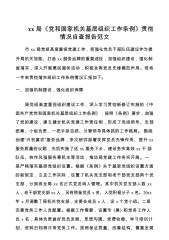 xx局《党和国家机关基层组织工作条例》贯彻情况自查报告范文市xx局党组高度重视党建工作,把强化党员干部队伍建设作为提升局机关效能、打造xx服务品牌的重要途径,加强组织建设,强化制度落实,深入开展惠民服务活动,积极发挥党员先锋模范作用。现将一年来贯彻落实组织工作条例情况汇报如下。一、加强机制建设,强化组织保障局党组高度重视组织建设工作,深入学习贯彻新修订实施的《中国共产党党和国家机关基层组织工作条例》,按照《条例》要求,加强了党的建设,建立健全机关党建工作责任制,形成了党组领导、支部统筹、小组负责、一把手亲自抓、分管领导具体抓的工作格局。围绕创建“兴机富农”服务品牌,多次研究部署发挥党员先锋作用...