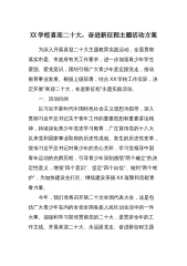 XX学校喜迎二十大,奋进新征程主题活动方案为深入开展喜迎二十大主题教育实践活动,全面贯彻落实市委、市政府有关工作要求,进一步加强青少年学生爱国、爱党意识,团结引领广大青少年坚定跟党走,推动教育事业发展。根据上级部署,结合XX学校工作实际,决定开展“喜迎二十大,在进新征程”主题实践活动。一、活动目的以习近平新时代中国特色社会主义思想为指导,深入贯彻习近平总书记关于青年工作的重要思想和重要讲话精神,持续深化青少年党史学习教育,广泛宣传党的十八大以来党和国家事业取得的历史性成就、发生的历史性变革,宣传习近平总书记对青少年的关心关怀,学习党领导中国青年运动的光辉历程,引导青少年深刻感悟“两个确立”的决...