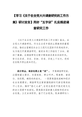 市委领导干部学习《关于在全党大兴调查研究的工作方案》心得体会研讨发言(5篇)学习《关于在全党大兴调查研究的工作方案》心得体会研讨发言材料近日,中共中央办公厅印发《关于在全党大兴调查研究的工作方案》。方案指出,在全党大兴调查研究,作为在全党开展的主题教育的重要内容,推动全面建设社会主义现代化国家开好局起好步。调查研究是我们党的传家宝,是做好各项工作的基本功。党的十八大以来,习近平总书记高度重视调查研究工作,作出系列重要讲话和重要指示,为全党大兴调查研究、做好各项工作提供了根本遵循。广大党员干部要时时研读、深刻领会,把调查研究工作做深、做细、做出成效,精心烹制一道“四有”调研“硬菜”。瞄准“问题”...