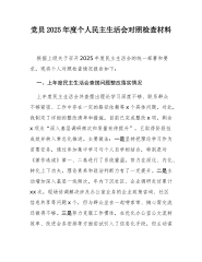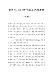XX市人大常委会副主任2025年度民主生活会个人对照检查材料(五个带头)根据市委关于召开2025年度民主生活会的统一部署,我严格按照通知要求,在深入学习领会习近平新时代中国特色社会主义思想,特别是党的二十届三中、四中全会精神的基础上,紧紧围绕本次民主生活会主题,通过群众提、自己找、上级点、互相帮等多种方式,广泛征求意见建议,深入开展谈心谈话,全面梳理检视问题。现将个人对照检查情况报告如下。一、存在的主要问题(一)在带头强化政治忠诚、提高政治能力方面一是理论武装的深度和转化率有待提升。尽管能够坚持参加常委会党组理论学习中心组的集体学习,但有时因分管领域工作繁杂、事务性会议和调研活动较多,对新思想、新理论、新论断的系统性钻研不够深入,特别是对党的二十大及二十届三中、四中全会精神中关于发展新质生产...