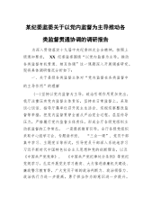 某纪委监委关于以党内监督为主导推动各类监督贯通协调的调研报告为深入贯彻落实十九届中央纪委四次全会精神,按照上级通知要求,XX纪委监委围绕“以党内监督为主导,推动各类监督有机贯通、相互协调”这一课题深入开展调查研究。现将具体调研情况分析如下:一、关于县级各类监督主体对“党内监督在各类监督中的主导作用”的理解(一)坚持以党内监督为主导,政治引领作用更加突出。我厅注重压实党内监督主体责任,坚持在日常监督上,采取谈心谈话、指导厅属单位召开民主生活会、巡视巡察整改监督等举措,把党内监督贯穿全面从严治党全过程,层层传导压力,严格履行党内监督主体责任,形成全厅各级党组织主动抓监督的工作常态。一是狠抓教育引导...