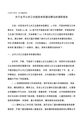 (仅供学习参考,切勿通篇使用)关于全市公共卫生服务体系建设情况的调研报告为进一步促进全市公共卫生服务体系建设,x月份,市政协科教文卫体委员会,先后赴xx县、xx县市及市直相关部门进行专题调研,听取政府和卫生部门的情况汇报,实地察看了xx个单位的公共卫生服务体系的建设情况。通过调研,委员们基本掌握了我市公共卫生服务体系建设的情况,存在的困难和问题,在分析、讨论的基础上,对如何加快全市公共卫生服务体系建设提出了一些意见、建议。现将主要情况报告如下:一、全市公共卫生服务体系建设情况近年来,市委、市政府十分重视公共卫生服务工作,将其作为深化医药卫生体制改革的重要内容,抢抓国家强力推进公共卫生服务体系建...