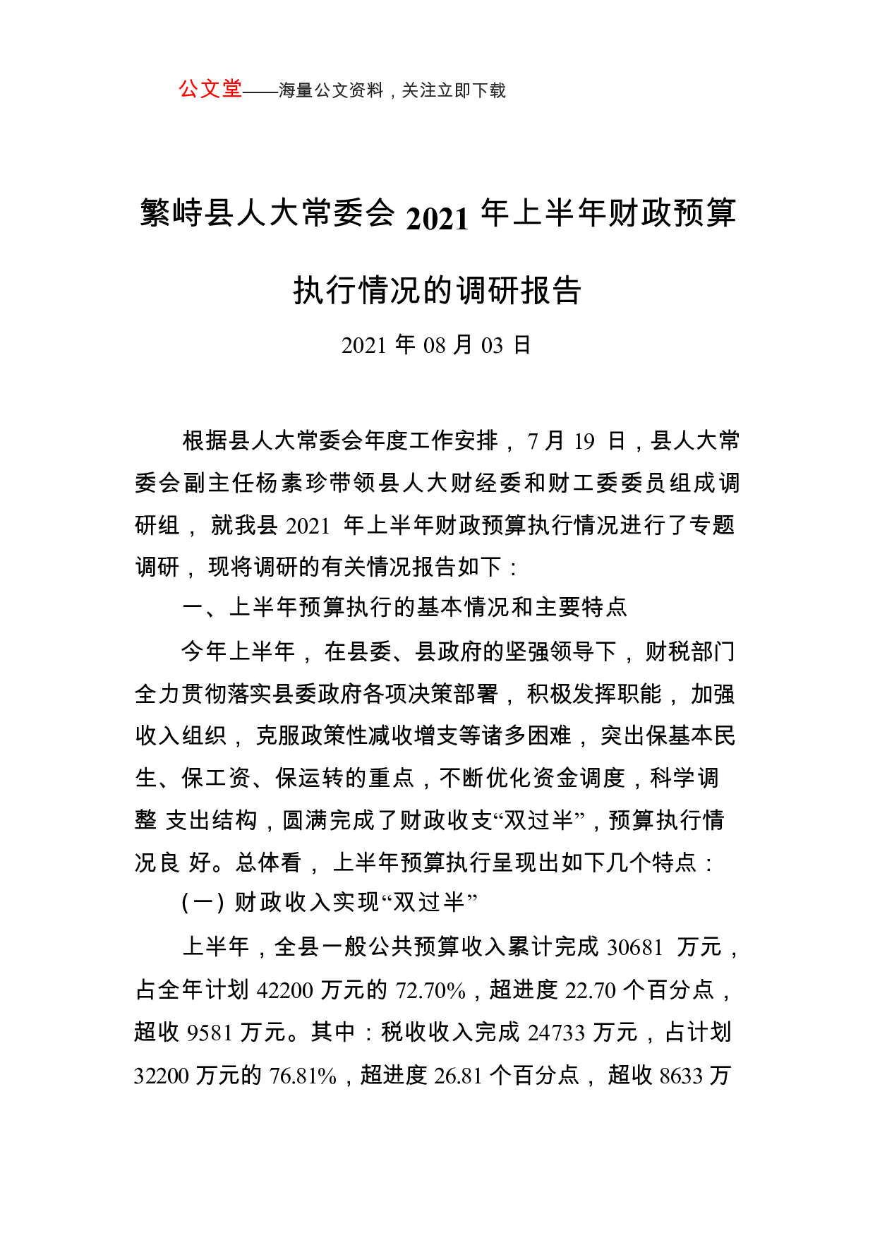 公文堂——海量公文资料,关注立即下载繁峙县人大常委会2021年上半年财政预算执行情况的调研报告2021年08月03日根据县人大常委会年度工作安排,7月19日,县人大常委会副主任杨素珍带领县人大财经委和财工委委员组成调研组,就我县2021年上半年财政预算执行情况进行了专题调研,现将调研的有关情况报告如下:一、上半年预算执行的基本情况和主要特点今年上半年,在县委、县政府的坚强领导下,财税部门全力贯彻落实县委政府各项决策部署,积极发挥职能,加强收入组织,克服政策性减收增支等诸多困难,突出保基本民生、保工资、保运转的重点,不断优化资金调度,科学调整支出结构,圆满完成了财政收支“双过半”,预算执行情况良...