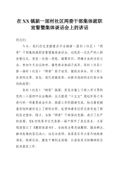 在XX镇新一届村社区两委干部集体就职宣誓暨集体谈话会上的讲话同志们:今天,我们在这里隆重召开全镇新一届村(社区)“两委”干部集体就职宣誓暨集体谈话会,这既是一次庄严的入职宣誓仪式,更是一次统一思想、凝聚共识、明确方向的动员大会。参加今天会议的有,镇党委全体班子成员,各村(社区)新一届村(社区)“两委”班子成员,镇机关各办、所(局)负责同志等。首先,我代表镇党委,向新当选的同志们表示热烈的祝贺!各村(社区)“两委”换届,是在全镇上下深入学习贯彻党的二十届四中全会精神、全力推进“十五五”规划开局之年进行的一项重要政治任务。换届工作的圆满完成,标志着我镇基层组织建设迈上了新的台阶,也意味着各位同志肩负起了新的历史使命。刚才,全体“两委”干部面向党旗,进行了庄严的宣誓,XX村党委书记代表新一届干部作...