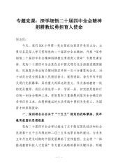 专题党课:深学细悟二十届四中全会精神躬耕教坛勇担育人使命同志们:今天,我们XX小学第一党支部在这里召开党员大会,主要任务是深入学习贯彻党的二十届四中全会精神,开展“深学细悟二十届四中全会精神躬耕教坛勇担育人使命”专题党课宣讲。党的二十届四中全会是在以中国式现代化全面推进强国建设、民族复兴伟业的关键时期召开的一次十分重要的会议,对于动员全党全国各族人民团结奋斗、锐意进取,奋力书写中国式现代化新篇章,具有重大而深远的意义。作为基础教育一线的党员教师,我们必须先学一步、学深一层,切实把思想和行动统一到全会精神上来,把智慧和力量凝聚到落实全会确定的各项任务上来,在躬耕教坛的生动实践中勇担为党育人、为国育才的崇高使命。一、深刻领会全会关于“十五五”规划的战略擘画,筑牢教育报国的思想根基党的二十届四中全...