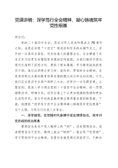 党课讲稿:深学笃行全会精神,凝心铸魂筑牢党性根基同志们:党的二十届四中全会,是在中华人民共和国成立76周年之际,也是在实现“十四五”规划目标任务的关键节点上,召开的一次具有全局性、历史性意义的重要会议。全会擘画了未来五年乃至更长时期国家发展的宏伟蓝图,为我们推进中国式现代化指明了前进方向、提供了根本遵循。作为教育战线的党员干部,我们必须带头学习好、宣传好、贯彻好全会精神,自觉将其转化为推动教育改革发展的强大动力和生动实践。今天,我们在这里召开全局干部职工大会,并举行一次专题党课。主要目的,是深入学习领会党的二十届四中全会精神,统一思想、凝聚共识、明确方向,动员全局上下以更加饱满的热情和更加扎实的作风,奋力开创我县教育事业高质量发展的新局面。下面,我围绕“深学笃行四中全会精神凝心铸魂筑牢党性根...