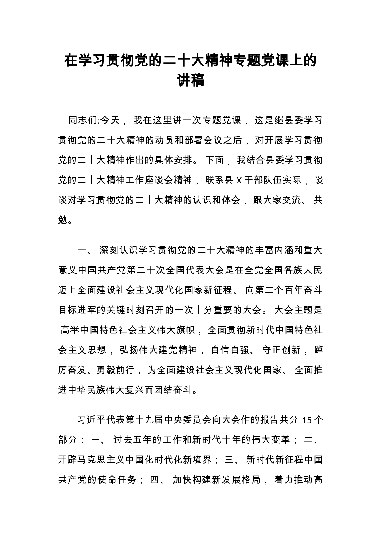 党课讲稿:学习贯彻党的二十大精神在新的历史征程上担当新使命、展现新作为同志们:举国关注、举世瞩目的中国共产党第二十次全国代表大会10月16日在北京隆重开幕。党的二十大是在迈上全面建设社会主义现代化国家新征程、向第二个百年奋斗目标进军的关键时刻召开的一次十分重要的大会。大会明确宣示党在新征程上举什么旗、走什么路、以什么样的精神状态、朝着什么样的目标继续前进,对全面建成社会主义现代化强国两步走战略安排进行宏观展望,科学谋划未来5年乃至更长时期党和国家事业发展的目标任务和大政方针。事关党和国家事业继往开来,事关中国特色社会主义前途命运,事关中华民族伟大复兴,对鼓舞和动员全党全军全国各族人民坚持和发展...