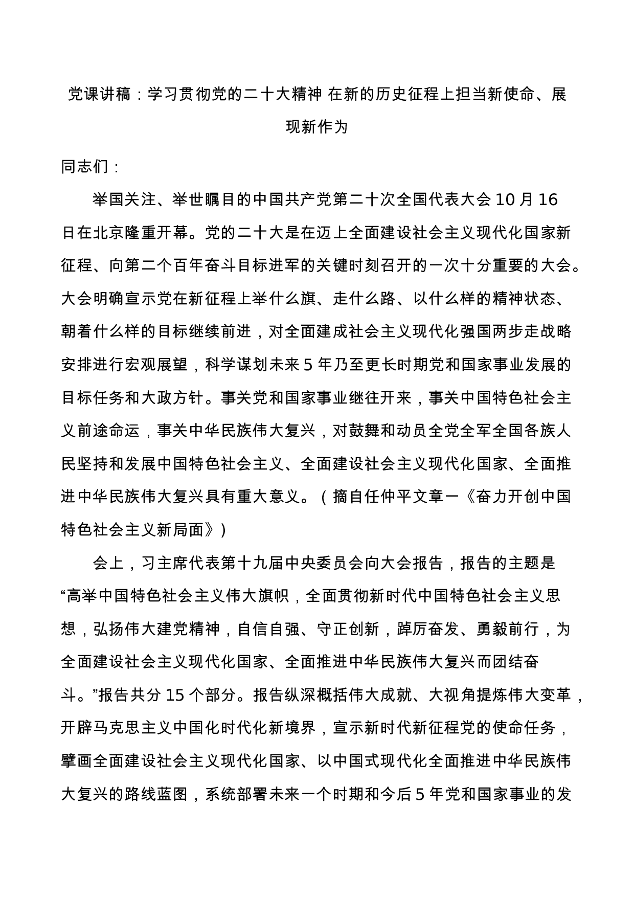 二十大党课讲稿:学习贯彻党的二十大精神 在新的历史征程上担当新使命、展现新作为