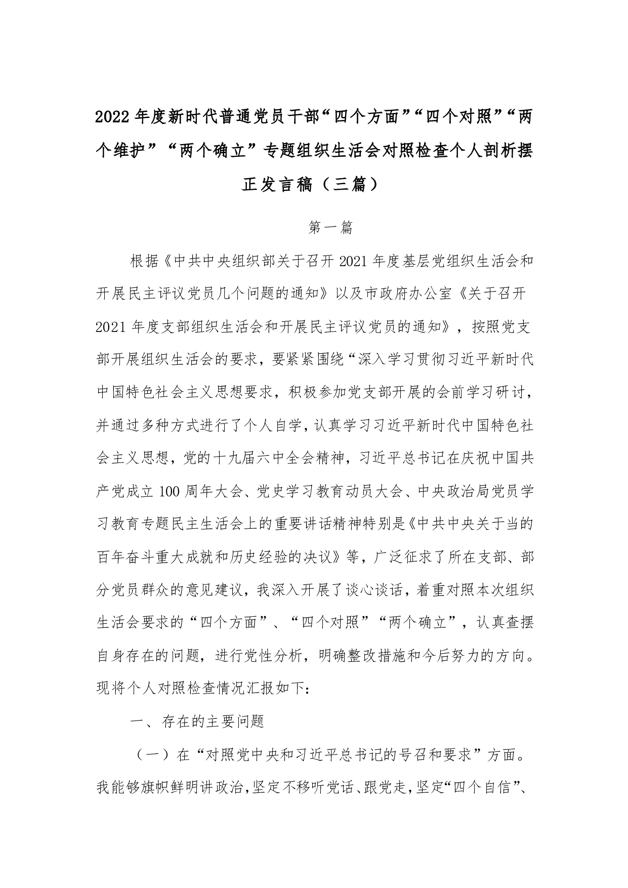 2022年度新时代普通党员干部“四个方面”“四个对照”“两个维护”“两个确立”专题组织生活会对照检查个人剖析摆正发言稿(三篇)第一篇根据《中共中央组织部关于召开2021年度基层党组织生活会和开展民主评议党员几个问题的通知》以及市政府办公室《关于召开2021年度支部组织生活会和开展民主评议党员的通知》,按照党支部开展组织生活会的要求,要紧紧围绕“深入学习贯彻习近平新时代中国特色社会主义思想要求,积极参加党支部开展的会前学习研讨,并通过多种方式进行了个人自学,认真学习习近平新时代中国特色社会主义思想,党的十九届六中全会精神,习近平总书记在庆祝中国共产党成立100周年大会、党史学习教育动员大会、中央...