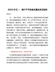 2023年五一、端午节节前集体廉政谈话提纲同志们:五一、端午节将至,为深入贯彻中央八项规定精神及其实施细则,落实党风廉政建设工作要求,进一步严明节日纪律,防止“四风”问题反弹,确保安全、廉洁、文明过节,今天在这里召集节前廉政谈话。俗话说节点就是“考点”,既是对党员领导干部廉洁自律意识的考验,也是我们落实“两个责任”、抓党风廉政建设、正风肃纪的关键节点。越是过节期间,越要防微杜渐,越要警钟长鸣,越要保持清醒。2023年是全面贯彻党的XX大精神开局之年,是实施“十四五”规划承上启下的重要一年。做好党风廉政建设工作责任重大、意义重大。因此,不仅要筑牢底线和红线意识,严格落实党风廉政建设“一岗双责”责...