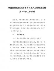 市国资委党委2025年乡村振兴工作情况总结及下一步工作计划2025年,市国资委党委深入贯彻落实党中央、省、市关于乡村振兴战略的决策部署,充分发挥国资系统资源优势,积极履行社会责任,扎实推进乡村振兴各项工作,取得了阶段性成效。现将本年度工作情况总结如下,并对下一步工作作出计划。一、工作开展情况(一)强化组织领导,构建乡村振兴工作体系市国资委党委高度重视乡村振兴工作,将其作为一项重要的政治任务来抓。成立了以党委书记为组长的乡村振兴工作领导小组,明确了各成员的职责分工,确保工作有序推进。领导小组定期召开专题会议,研究部署乡村振兴工作,及时解决工作中遇到的问题。同时,建立了乡村振兴工作联络员制度,加强与对口帮扶村的沟通协调,形成了上下联动、协同推进的工作格局。为了确保乡村振兴工作的长效性和稳定性,市...