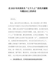 在2025年州直机关“七下八上”防汛关键期专题会议上的讲话同志们:现在,我们召开这次专题会议,核心任务是深入学习贯彻习近平总书记在中央城州工作会议和在河南考察时关于防范化解重大风险、保障人民生命财产安全的重要指示精神,坚决落实省委、省政府关于防汛救灾工作的系列部署。当前,我们已进入“七下八上”防汛最关键、最吃劲的时期。习近平总书记反复强调:“始终把保障人民群众生命财产安全放在第一位”。这既是根本要求,也是我们肩负的政治责任。本次会议旨在动员全州上下,清醒认识极端天气事件频发、防汛形势严峻复杂的现实挑战,深刻理解守住防汛安全底线、筑牢安全防线的极端重要性和紧迫性,统一思想认识,压实各级责任,强化落实举措,务必以最高标准、最严要求、最实作风,坚决打赢今年防汛抗洪这场硬仗,为全州经济社会高质量发展...