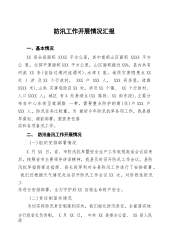 防汛工作开展情况汇报一、基本情况XX县全县面积XXXX平方公里,其中南部山区面积XXXX平方公里,北部平原面积XXX平方公里,山区面积接近XX%,县内共有河流XX条(包括过境河流渭河),水库X座,地质灾害隐患点XX处(涉及XX个行政村,XXX户XXX人,XXX间房屋,道路XXXX米),山洪灾害危险区XX处,涉及XX个镇、XX个行政村、人口XXXX人;城区有X处易涝点(XX路段、XX街东段),主要分布在中心东街至莲湖路一带,需要重点防护的商(住)户XXX户XXX人,防汛任务比较重。为做好今年防汛抗旱各项工作,我县提早谋划、超前部署,狠抓责任落实和各项备汛工作。二、防汛备汛工作开展情况(一)组织安...