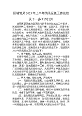 区城管局2023年上半年防汛应急工作总结及下一步工作打算按照区委区政府及区防汛抗旱指挥部减灾工作要求,区城管局树立“安全第一、常备不懈、以防为主、防重于抢”工作方针,成立以局党委书记、局长为组长,分管副大队长为副组长,各中队和机关各科室负责人为成员的防汛应急领导小组,修订和完善了《XX区城管局防汛应急预案》,建立健全岗位工作责任制、值班制度、汛情报告制度等一系列防汛工作制度。组织40名城区防汛应急队伍,在城区各重点地段路段进行巡查、紧急排水和交通疏导,开展2次防汛演练活动,顺利完成本年度防汛应急工作,现就我局2023年防汛应急工作总结如下:一、领导重视,提高认识,组织落实区城管局成立以来,就将...