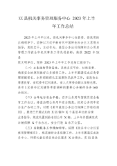 XX县机关事务管理服务中心2023年上半年工作总结2023年上半年以来,县机关事务中心在县委、县政府的正确领导下,坚持以习近平新时代中国特色社会主义思想为指导,真抓实干,主动作为,基层公务出行保障和办公用房管理工作获全市机关事务工作先进表彰;荣获2022年XX县级文明单位。现将2023年上半年工作总结汇报如下:(一)公务接待节俭高效。坚持务实节俭、杜绝浪费、确保安全的原则做好公务接待工作。上半年圆满完成应急管理部副部长、水利部副部长王道席防汛抗旱工作,省政协主席唐良智、省纪委书记刘海泉、省人大常委会副主任杨光荣、某市X区委书记刘健等考察调研的重要公务接待任务160余批次。(二)公车运行安全平稳...