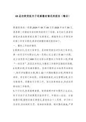XX县妇联党组关于巡察整改情况的报告(精品)根据县委统一部署,2024年XX月XX日至2025年X月XX日,县委第二巡察组对县妇联党组进行了巡察。X月X日,县委巡察组向县妇联党组反馈了巡察意见。根据党务公开原则和巡察工作有关要求,现将巡察整改情况报告如下。一、整改工作组织情况1.提高站位,压实主体责任。县妇联党组坚决扛起主体责任,第一时间召开专题会议,统一思想认识,全面认领33个问题。成立由党组书记XXX同志任组长的整改工作领导小组,明确“一岗双责”,层层压实责任,为整改工作提供坚强组织保障。2.统筹协调,系统推进整改。坚持问题导向与结果导向相统一,制定详细整改方案,建立33个问题的整改台账,明确责任领导、责任部门和时限。定期调度推进,动态管理台账,实行对账销号。将整改与日常工作、深化改革相...