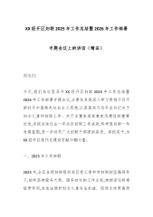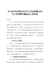 XX经开区妇联2025年工作总结暨2026年工作部署专题会议上的讲话(精品)同志们:今天,我们在这里召开XX经开区妇联2025年工作总结暨2026年工作部署专题会议,主要任务是深入学习贯彻习近平新时代中国特色社会主义思想,认真落实习近平总书记关于妇女儿童和妇联工作、关于注重家庭家教家风建设的重要论述,系统总结过去一年全区妇联工作成效,科学谋划新一年发展蓝图,进一步动员广大妇联干部团结奋进、真抓实干,为XX经开区现代化建设贡献巾帼力量。一、2025年工作回顾2025年,全区各级妇联组织在区党工委和市妇联的坚强领导下,始终坚持服务大局、服务妇女的工作主线,持续深化桥梁纽带作用,在依法维护妇女儿童合法权益、促进女性更高质量创业就业、深化家庭家教家风建设等领域取得了新的突破,各项工作呈现出重点突出、...