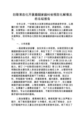妇联常态化开展婚姻家庭纠纷预防化解情况的总结报告今年以来,**妇联充分发挥妇联组织桥梁纽带作用,认真履行部门职责,不断建立健全宣传引导、排查预防、化解处置、关爱帮扶一体化维权工作机制,不断加强妇女儿童普法教育,有效预防化解婚姻家庭矛盾纠纷,对妇女儿童开展全方位关爱帮扶,现将常态化预防和化解婚姻家庭纠纷的情况概括如下。一、工作进展一是统筹安排部署,依托实际工作职责。妇联把预防化解婚姻家庭纠纷作为重点工作,制定下发了《**妇联2022年妇女儿童权益维护工作安排意见》,调整充实了婚姻家庭纠纷人民调解委员会成员,制定下发了《**妇联执委维权暨信访业务能力提升培训工作方案》,分阶段举办了14期2000余...