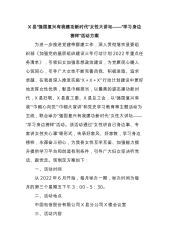 X县“强国复兴有我建功新时代”女性大讲坛——“学习身边榜样”活动方案为进一步推进党建带群建工作,深入贯彻落实县委组织部《加强党的基层组织建设三年行动计划2022年重点任务清单》,引领妇女加强思想政治建设,为党聚民心暖人心筑同心,引导广大女性不断完善自我、积极进取、追求卓越,在我县深入推进实施“X+X+X”行动计划建设中更好地发挥女性优势,彰显巾帼担当,以最美的姿态建功新时代,X县妇联、X县直工委、X县总工会,以“强国复兴有我”“巾帼心向党”“巾帼大宣讲”和党史学习教育等主题活动为主线,联合举办“强国复兴有我建功新时代”女性大讲坛——“学习身边榜样”活动。该活动通过“女性讲自己身边事、专家讲女性...