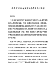 在全区2026年文旅工作会议上的讲话同志们:今天,我们在这里召开**区2026年文旅工作会议,主要任务是深入贯彻落实省委、市委、区委关于文旅发展、消费提振、项目建设的最新部署要求,全面总结2025年全区文旅体工作,客观分析当前面临的形势任务,研究部署2026年重点工作,动员全区文旅战线进一步统一思想、凝聚共识,奋力推动**文旅体事业高质量发展,为建设世界知名文化旅游目的地会客厅贡献文旅力量。刚才,**同志传达了上级会议精神,并对文旅领域群腐集中整治相关工作进行了部署,启动了树立和践行正确政绩观学习教育,这些工作都很重要,希望大家认真抓好落实。会议还通报了2025年受表彰的先进个人及职级晋升情况,让我们以热烈的掌声向受表彰的同志表示祝贺!希望全区文旅体战线全体同仁以先进为榜样,比学赶超、奋勇争...