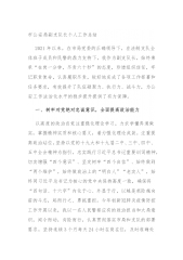 市公安局副支队长个人工作总结2021年以来,在市局党委的正确领导下,在法制支队全体班子成员和民警的鼎力支持下,我作为副支队长,始终秉承“在岗一分钟,尽责六十秒”的态度,珍惜组织信任,牢记职责使命,认真履职尽责,较好地完成了各项工作部署和任务要求,有效提升了队伍凝聚力、执行力、战斗力,为公安工作法治化水平的稳步提升提供了有力保障。一、树牢对党绝对忠诚意识,全面提高政治能力以高度的政治自觉注重强化理论学习,力求学懂弄通做实,掌握精神实质和核心要义,着力强化理论武装。注重提高政治站位,坚持以党的十九大和十九届二中、三中、四中、五中全会精神为指引,忠实践行习近平总书记重要训词精神,切实增强“四个意识”...