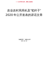 ——公文写作之家,体制人加油站农业农村局局长及“笔杆子”2020年公开发表的讲话文章“如椽巨笔1”微信公众号2021年1月一、省级1.河北省农业农村厅:河北:落实主体责任探索四种模式12.湖南省农业农村厅:湖南:质量标识凭证三要素有机结合23.浙江省农业农村厅:浙江:实现“一证一码”全覆盖34.山西省农业农村厅党组书记、厅长乔建军:做好“三农”工作|推进农业现代化45.江西省农业农村厅厅长胡汉平:在大战大考中交出“三农”满意答卷6.山西省农业农村厅办公室副主任武少东:6牢记领袖殷殷嘱托奋力77.浙江省农业农村厅课题组:撬动乡村振兴的有效支点浙江省闲置宅基地和闲置农房盘活利用调查98.山西省农业...