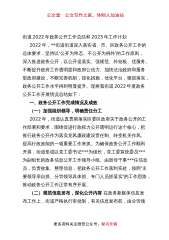 公文堂公文写作之家,体制人加油站区水利局2022年政务公开工作总结和2023年的工作思路2022年以来,**区水利局政务公开工作严格按照国务院《2022年政务公开工作要点》的规定精神,紧紧围绕省、市、县政务公开工作部署和要求,结合工作实际,规范政务公开内容,坚持突出重点、高效便民、问题导向,积极全面做好政务公开的管理工作。现将2022年以来的工作情况和2023年的工作思路报告如下:一、2022年工作完成情况(一)从建章立制入手,加大政务公开力度。为使政务公开工作不流于形式,不走过场,我局着眼于建立政务公开长效机制,使政务公开成为一种自觉的意识和行为。一是加强组织领导,提供组织保障。根据领导分工...