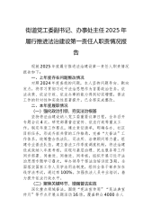 街道党工委副书记、办事处主任2025年履行推进法治建设第一责任人职责情况报告现就2025年度履行推进法治建设第一责任人职责情况报告如下:一、上年度存在问题整改情况对照2024年度查找的问题,本人坚持问题导向、靶向发力,将学习贯彻习近平法治思想作为首要政治任务,依法决策、依法行政、依法办事的能力得到切实增强,普法工作的针对性和实效性显著提升。已全部完成整改。二、本年度履职情况(一)强化政治引领,夯实法治根基坚持将法治建设纳入党工委重要议事日程,全年召开专题会议4次,研究部署普法宣传、依法行政等重点工作。制定年度工作要点,建立责任清单,明确各办、社区目标任务,形成齐抓共管的工作格局。完善“大普法”工作体系,统筹整合执法队、司法所、法律顾问等力量,组建专业普法队伍。建立普法工作季度调度机制,将法治...