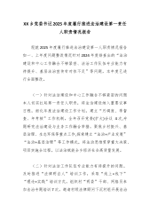XX乡党委书记2025年度履行推进法治建设第一责任人职责情况报告现就2025年度履行推进法治建设第一人职责情况报告如一、上年度问题整改情况针对2024年度排查出的“法治建设和中心工作融合不够紧密、法治工作队伍专业能力有待提升、基层法治宣传针对性不足”等问题,本年度已进行全面整改。 (一)针对法治建设和中心工作融合不够紧密的问题本人切实扛起第一责任人职责,将法治建设纳入重要议事日程,细化年度法治建设工作计划,建立“月调度、季督查、年考核”工作机制,全年召开党委(扩大)会议4次,专题研究法治建设与业务工作融合举措,聚焦乡村振兴、基层治理、生态环保等重点工作,探索建立“法治+产业发展”“法治+基层治理”等工作模式,将法治思维贯穿重大决策、项目实施全过程,以法治赋能全乡经济社会高质量发展。 ...