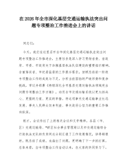 在2026年全市深化基层交通运输执法突出问题专项整治工作推进会上的讲话同志们:今天,我们在这里召开全市深化基层交通运输执法突出问题专项整治工作推进会,主要任务是深入学习贯彻省委、省政府、市委、市政府关于加强基层执法队伍建设的重要指示精神,全面落实省、市纪委监委的工作提示要求,回顾总结前一阶段专项整治工作的成效与不足,分析当前面临的严峻形势和复杂挑战,审议并部署《持续深化全市基层交通运输执法领域突出问题专项整治工作方案》,动员全市交通运输系统以更大的决心、更强的力度、更实的举措,将这项事关交通运输事业长远发展、事关人民群众切身利益、事关政府公信力的重要工作推向纵深。刚才,会议传达了上级相关会议和文件精神,各县(市、区)交通运输局、*新区社会事业管理局以及市交通运输综合行政执法支队的负责同志分别...