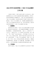 2024年学习宣传贯彻二十届三中全会精神工作方案中国共产党第二十届中央委员会第三次全体会议,是在全面建设社会主义现代化国家新征程的关键时期,召开的一次具有里程碑意义的重要会议。为深入学习宣传贯彻党的二十届三中全会精神,切实把全体党员干部职工思想行动统一到党的二十届三中全会精神上来,把智慧力量凝聚到党的二十届三中全会确定的各项任务上来,结合系统实际,制定学习宣传贯彻党的二十届三中全会精神计划方案。一、目的要求。深刻领会学习党的二十届三中全会报告的重大政治意义、理论意义和现实意义,努力把握其思想精髓、核心要义和实践要求,力争做到学深学透、入脑入心,始终牢记“三个务必”,教育引导广大干部群众深刻领悟...