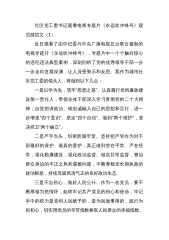社区党工委书记观看电视专题片《永远吹冲锋号》观后感范文(1)近日观看了由中纪委与中央广播电视总台联合摄制的电视专题片《永远吹冲锋号》,专题片中一个个触目惊心的违纪违法典型案例,深刻剖析了党的优秀领导干部一步一步走向贪腐深渊,让人深受警示和反思。我作为城市社区党工委的领头人,将做到以下几点:一是以学为先,筑牢“思想之基”。认真履行党风廉政建设第一责任人,带领全体干部深入学习贯彻党的二十大精神,自觉把讲政治、铸忠诚融入自己的思想和言行,进一步增强“四个意识”、坚定“四个自信”、做到“两个维护”,坚决捍卫“两个确立”。二是严字当头,织密防腐牢笼。坚持把严管作为对干部最好的保护、最真的爱护,真正做到管...