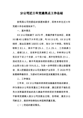 分公司近三年党建亮点工作总结按照局公司党委组织部通知要求,现将本单位近三年党建工作总结报告如下。一、基本情况XX分公司始建于1970年,隶属伊春市金林区,距离XX镇40公里位于大丰河上游,与XX分公司、XX分公司相邻,施业区面积16855公顷,划分34个林班。现有在职职工61人,其中干部29人,工人29人,工伤疾病3人,借调16人,目前单位共有职工45人。丰岭林分公司党总支下设2个支部,4个党小组,其中在职党员23人,流动党员6人。黑木耳是我场现阶段群众主要增收项目,占全职工收入的70%以上。为进一步带领职工群众致富增收,深入挖掘适合我分公司发展的产业项目,于2020年引进蒿柳养蚕项目,为新时...