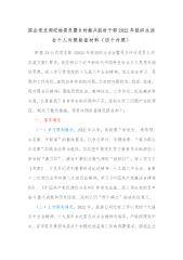 国企党支部纪检委员暨乡村振兴驻村干部2022年组织生活会个人对照检查材料(四个对照)根据XX公司党支部《2022年度组织生活会暨民主评议党员工作实施方案》要求,我坚持以习近平新时代中国特色社会主义思想为指导思想,深入学习贯彻党的十九届六中全会精神,本人结合学习、思想和工作实际,查找自身存在的问题,力求把问题找实、找深、找透。现对照会议精神:围绕思想政治、精神状态、工作作风、纪检廉政等方面,认真查找了自身存在的问题和不足,深刻分析了问题产生的原因,制定了整改措施。现将对照检查情况报告如下:一、落实情况(一)学习贯彻情况。2022年以来,我按照“学党史、悟思想、办实事、开新局”的整体要求,以学习研...