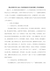 国企党委书记2021年度党组织书记抓党建工作述职报告2021年,在X集团党委的坚强领导下,X公司党委坚持以习近平新时代中国特色社会主义思想为指导,认真学习贯彻习近平总书记“七一”重要讲话精神及十九届x中全会精神,以加强党的政治建设为引领,认真履行第一责任人职责,为中心工作开展提供了坚强政治保证,现将履行全面从严治党主体责任和抓党建工作汇报如下:一、主要工作开展情况(一)抓担当作为,落实党建工作责任制一是加强班子建设。作为X领导班子班长,努力做到大事讲原则,小事讲风格,带头维护班子团结,注意听取不同意见,倡导坦诚相见,主动拿起批评与自我批评的武器,形成了心往一处想劲往一处使,既分工明确,又密切配...