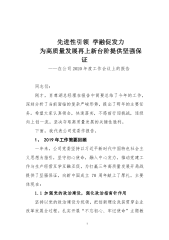 ·1先进性引领学融促发力为高质量发展再上新台阶提供坚强保证——在公司2020年度工作会议上的报告同志们:刚才,肖尊湖总经理在报告中简要总结了今年的工作,深刻分析了当前面临的复杂严峻形势,提出了明年的主要任务。希望大家认真领会,快速落实,不惑前行迎挑战,逐级向上创一流,坚决夺取高质量发展的关键性胜利。下面,我代表公司党委作报告。1、2019年工作简要回顾一年来,公司党委坚持以习近平新时代中国特色社会主义思想为指引,坚守初心使命,融入中心发力,推动党建工作与生产经营互学互融互促,为打赢三年高质量发展开局战提供了坚强保证,向新中国成立70周年献上了厚礼。主要体现在:1.1加强党的政治建设,强化政治指...