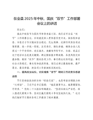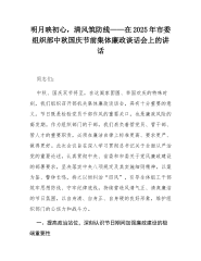明月映初心,清风筑防线——在2025年市委组织部中秋国庆节前集体廉政谈话会上的讲话同志们:中秋、国庆双节将至,在这阖家团圆、举国欢庆的特殊时刻,我们组织召开部机关集体廉政谈话会,具有十分重要的意义。节日既是检验党员干部作风的重要关口,也是廉政风险的高发期。作为组织部门的干部,我们肩负着管党员、管干部、管人才的重要职责,必须在廉洁自律上标准更高、要求更严、做得更好。此次会议旨在深入学习贯彻总书记关于全面从严治党的重要论述,认真贯彻中央、省委和市委关于党风廉政建设的部署要求,坚决落实中央八项规定及其实施细则精神,以案为鉴、警钟长鸣,持之以恒纠治“四风”,引导全体组工干部筑牢思想防线、守牢纪律底线,持续营造风清气正、清爽廉洁的节日氛围,以自身清、自身正、自身硬的良好形象,维护组织部门的公信力和战斗...